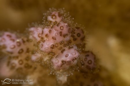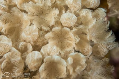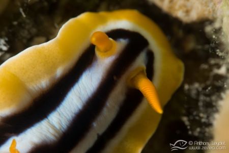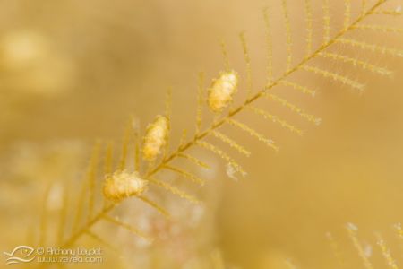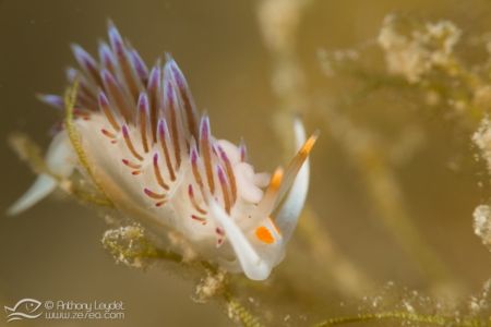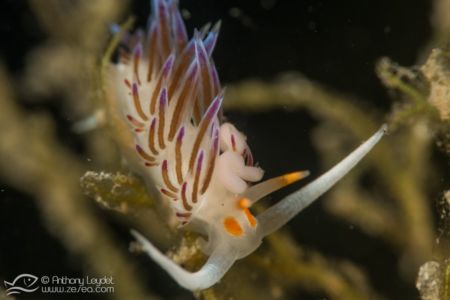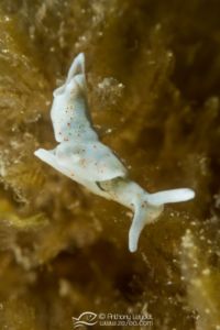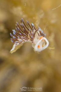 La MX4 offre un grossissement extrême, à savoir qu’elle va multiplier par 4 la focale de l’appareil. Prenons l’exemple de l’appareil avec lequel je l’ai utilisé, à savoir le Sony RX100-II. Sa focale maximale étant de 100mm, l’utilisation de la MX4 donne l’équivalent d’un 400mm. Imaginez un peu le potentiel que cela offre au photographe avide de très petites bêtes. Au niveau pratique, la distance de mise au point à 100mm se situe environ à 4cm du sujet. Vous l’aurez compris, la MX4 n’est pas destinée à photographier des sujets farouches ou en mouvement. En revanche, elle permettra de sublimer de minuscules sujets immobiles (ou presque), tels que des petits nudibranches, les polypes des coraux, et microfaune fixée, etc… Par exemple, voici une limace de mer (à gauche) qui ne fait pas plus d’1cm de longueur dont la photo n’a pas été recadrée (RX100-II à 100mm + MX4).
