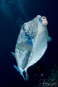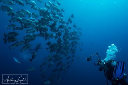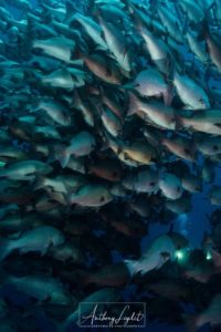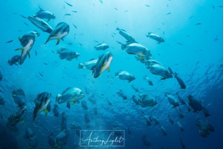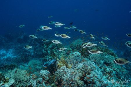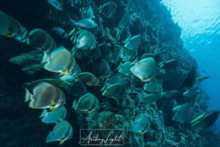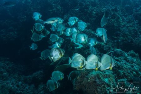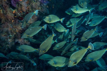La mise à l’eau se faisait habituellement dès la plateforme arrière du bateau, mais pour des raisons de sécurité, c’est désormais les zodiacs qui nous déposent à proximité du tombant. Nous commençons doucement à glisser le long du mur vertical et vertigineux… de plus de 750m de haut, au pied de Shark Reef ! Le courant se fait toujours un peu sentir, tantôt dans un sens tantôt dans l’autre, et c’est très bien. Car c’est bien quand il est présent que l’on a le plus de chance d’observer de superbes bancs de poissons en pleine eau. Les nasons flottent dans le bleu en banc, les carangues patrouillent, les gaterins forment des bancs compacts, ou encore les platax qui se comptent par dizaines, et qui nagent paisiblement à proximité des gorgones qui étendent leurs branches dans les courants.