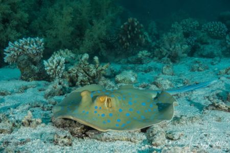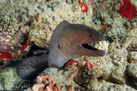 Une fois à l’abri des pinacles, et en remontant depuis les restes du Yolanda, un formidable jardin corallien s’ouvre aux plongeurs. Sur un fond sableux sont éparpillés une multitude de petits massifs de coraux. Et la vie est vraiment incroyable ici à Ras Mohamed. On peut y observer une quantité d’espèces de poissons phénoménale (Savez-vous qu’en Mer Rouge, on dénombre plus de 1000 espèces de poissons ?). Les murènes géantes sont nombreuses, tout comme les raies pastenagues à points bleus.