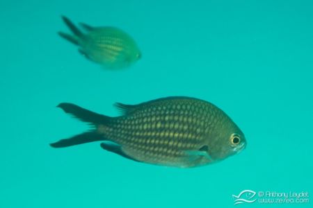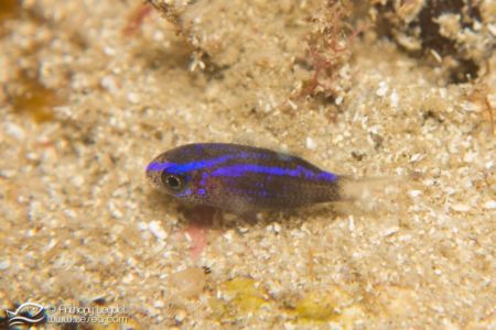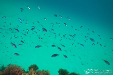 - La castagnole (Chromis chromis): nous les rencontrons tous les étés ! Ces petits bancs de poissons d’à peine 1 ou 2 cm bleues électriques qui s’agitent à la moindre bulle. Ils naissent et commencent à grandir dans les anfractuosités de la roche, où la femelle a déposé ses œufs, que le mâle s’empresse de féconder. En quelques mois, ils prendront la livrée des adultes.
