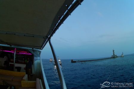 Il faut quelques heures de navigation pour arriver sur le récif d’Abu Kizan. En fait, c’est toute une nuit nécessaire puisqu’il s’agit du site le plus éloignée de la côte égyptienne. Le récif de Daedalus (plus connu sous ce com là) est quasiment au milieu de la Mer Rouge, en direction de l’Arabie Saoudite. Les traversées comme celle-là peuvent être assez mouvementée, avec une houle longue assez souvent établie. Alors quand on a la chance d’y passer par mer très calme, quel plaisir. Autant que de découvrir le magnifique récif surmonté de son célèbre phare avant même le lever du soleil, avec une mer ressemblant à un lac !