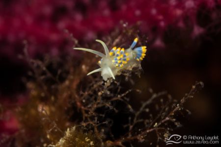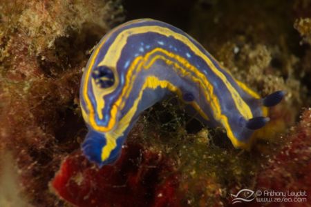 Commencez par chercher la « petite bête » sur les tombants par exemple, et privilégiez les zones plutôt à l’ombre. C’est ici qu’il sera le plus simple d’observer le plus de chose : limaces de mer parfois minuscules. Repérer les hydraires, les éponges ou les bryozoaires dont elles se nourrissent ! Bernard l’ermite, éponges, blennies, gorgones, coraux,… la liste des bons sujets pour la macro est longue ! Essayez de vous focaliser sur une petite surface, il faudra pour cela vous munir d’une lampe de plongée efficace, avec un faisceau large. Balayez la zone en long, en large et en travers, littéralement ! Vous verrez que petit à petit, ce petit monde apparaîtra. Le phare permet en effet de faire ré-apparaître les couleurs et les petites bêtes pleines de couleurs sautent alors aux yeux plus facilement.