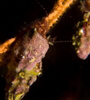 Peut-être ne remarquerez-vous même pas la petite crevette à quelques centimètres de là. Avec un corps d’une transparence étonnante, elle frôle l’invisibilité ! A peine plus visible, une minuscule galathée se fondra dans le décor au milieu des polypes, tout comme cette araignée aux pattes interminables. Toujours en Méditerranée, le plus photographié des habitants des gorgones est sans doute la délicate simnie blanche. Cette proche cousine des porcelaines vit exclusivement sur les branches des gorgones dont elle mange les polypes, sans pour autant mettre en péril sa colonie hôte. L’équivalent de la célèbre monnaie caraïbe ou encore des ovules des gorgones d’Asie.