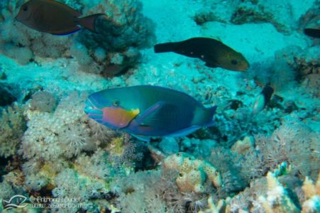 Assez proches des labres, mais possédant des dents soudées en véritable bec, les poissons perroquets sont impressionnant à regarder lorsqu’ils croquent dans les coraux durs comme dans du chocolat !